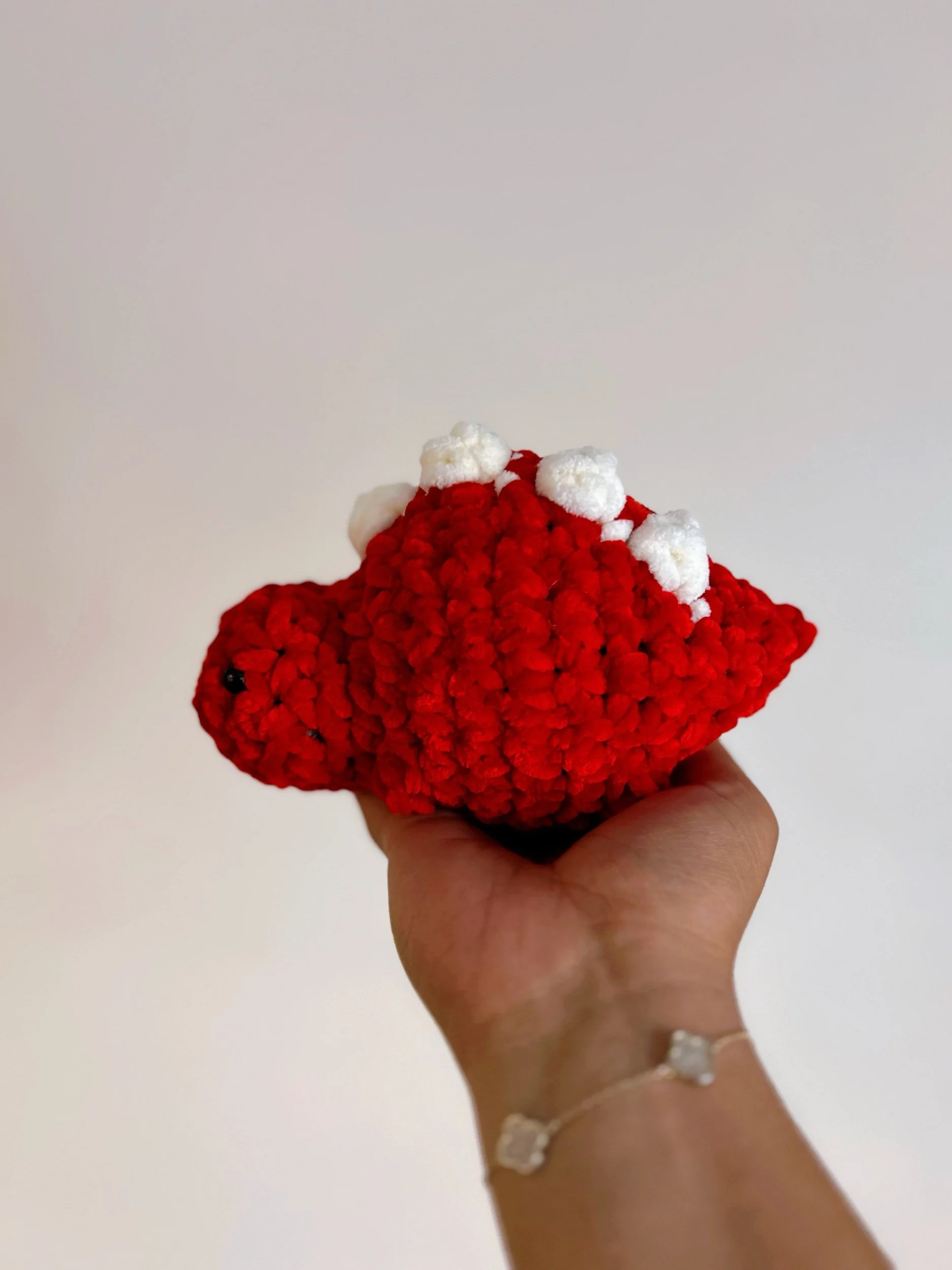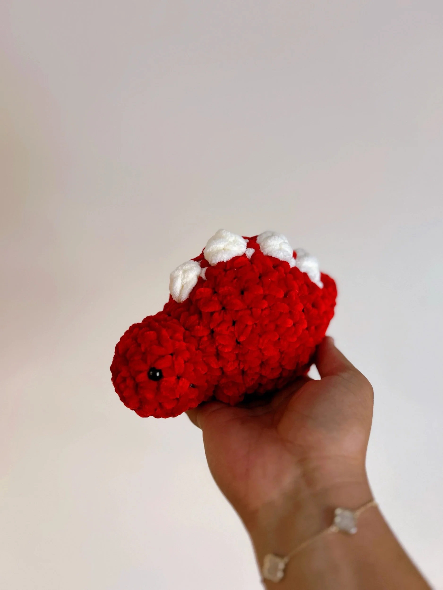 This charming crochet stegosaurus plush is a cozy, handmade treasure designed to bring a touch of prehistoric fun to any space. Crafted with ultra-soft, plush yarn, it features a rounded, cuddly body and signature raised plates along its back for that classic stegosaurus look. Its sweet, simple face and sturdy, squishy design make it perfect for little hands, nursery décor, or as a thoughtful gift for dinosaur lovers. Each plush is carefully made, giving it a unique personality that’s as lovable as it is timeless.